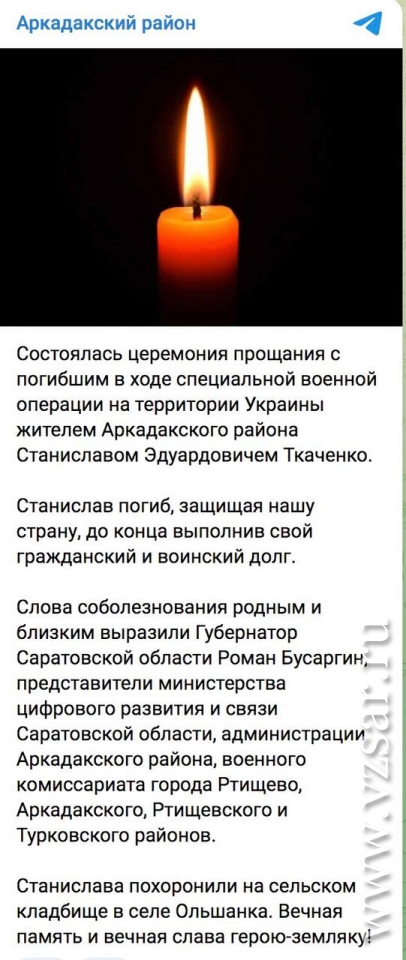 В селе Ольшанка простились со Станиславом Ткаченко, сообщает администрация Аркадакского района, а в Балашовском районе – с Алексеем Зайцевым, сообщает райадминистрация.