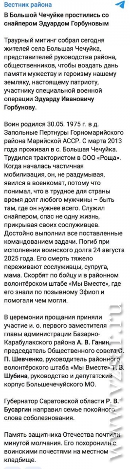 Базарно-Карабулакское издание "Вестник района" сообщает о состоявшемся вчера в селе Большая Чечуйка прощании с Эдуардом Горбуновым.