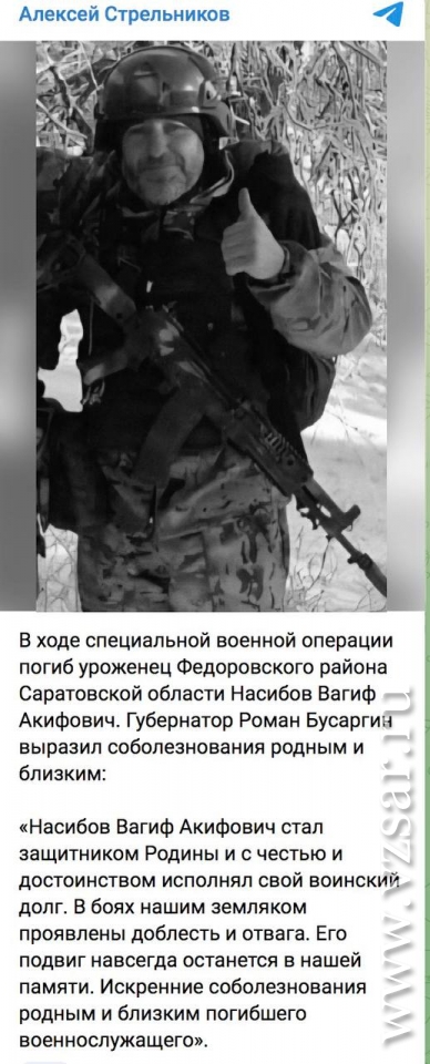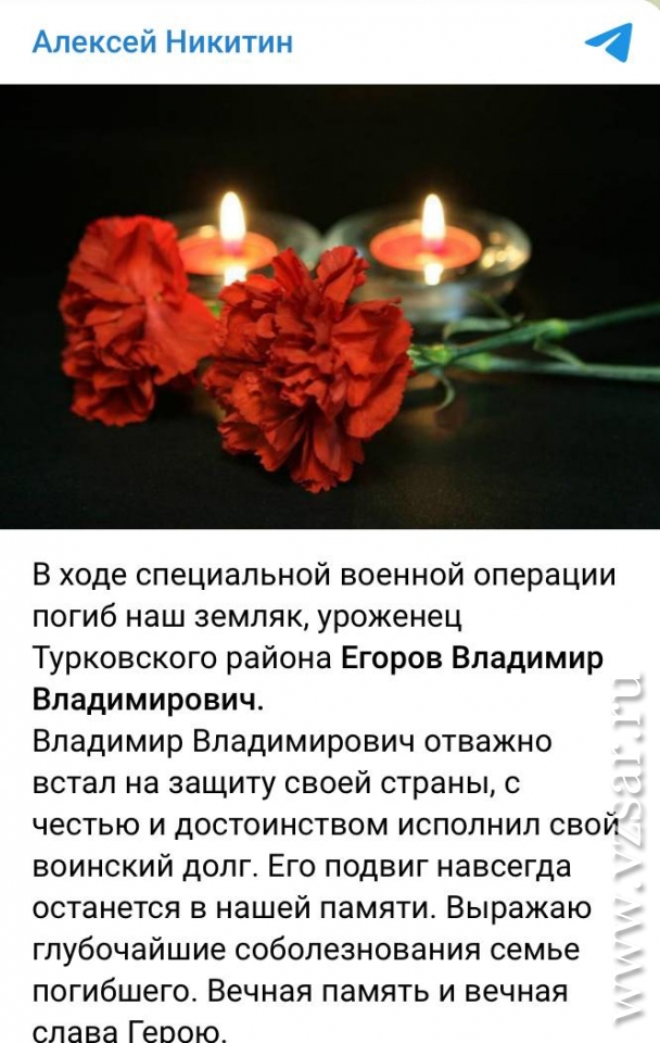 Глава Федоровского района Алексей Стрельников рассказал о гибели Вагифа Насибова, с которым простились вчера, а глава Турковского района Алексей Никитин сообщил о гибели Владимира Егорова.
