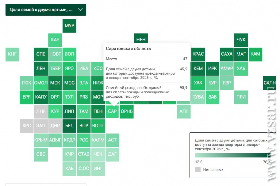 Саратовская область заняла в рейтинге 47-е место с уровнем доступности арендованного жилья в 45,9% (годом ранее – 49-е место с 44,7%, два года назад - 51-е место и 46,4%, три года назад - 45-е место и 35,2%, четыре года назад - 47-е и 37,4%).