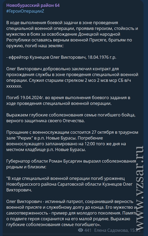 Администрация Новобурасского района рассказала, что сегодня пройдет прощание с погибшим ефрейтором Олегом Кузнецовым.