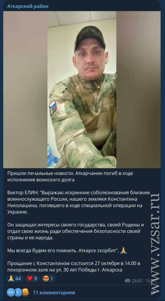 Также администрация Аткарского района сообщает, что сегодня в Аткарске простятся с погибшим Константином Николашиным.