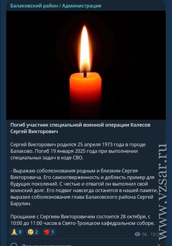 Также администрация Балаковского района сообщает, что завтра состоится прощание с погибшим Сергеем Колесовым.