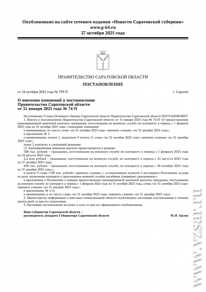 Согласно внесенным изменениям, единовременная денежная выплата предоставлялась в размере 700 тысяч рублей гражданам, поступившим на военную службу по контракту в период с 1 февраля 2025 года по 24 августа 2025 года, в размере 2,2 млн рублей –поступившим на военную службу по контракту в период с 25 августа по 27 октября 2025 года.