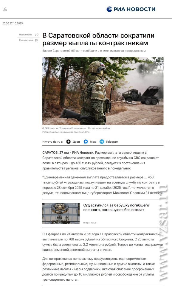 С сегодняшнего дня в Саратовской области гражданам, заключившим контракт на военную службу, будут выплачивать единовременную региональную выплату в пять раз меньше. Теперь она составляет 450 тысяч рублей.