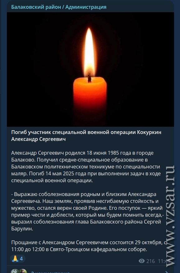 Администрация Балаковского района рассказала, что завтра пройдет прощание с погибшими Александром Кокуркиным и Евгением Куликовым.