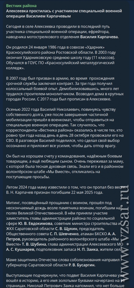 Базарно-Карабулакское издание "Вестник района" рассказало о прошедшем в селе Алексеевка прощании с погибшим ефрейтором Василием Карпачевым.