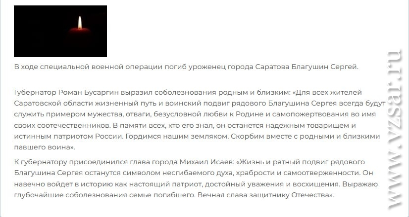 Администрация Саратова без подробностей сообщила о гибели Сергея Благушина.