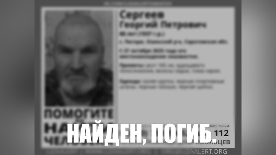 Пропавший без вести в Озинском районе Саратовской области 88-летний Георгий Сергеев погиб. Об этом сообщает поисковый отряд "Лиза Алерт Саратов".