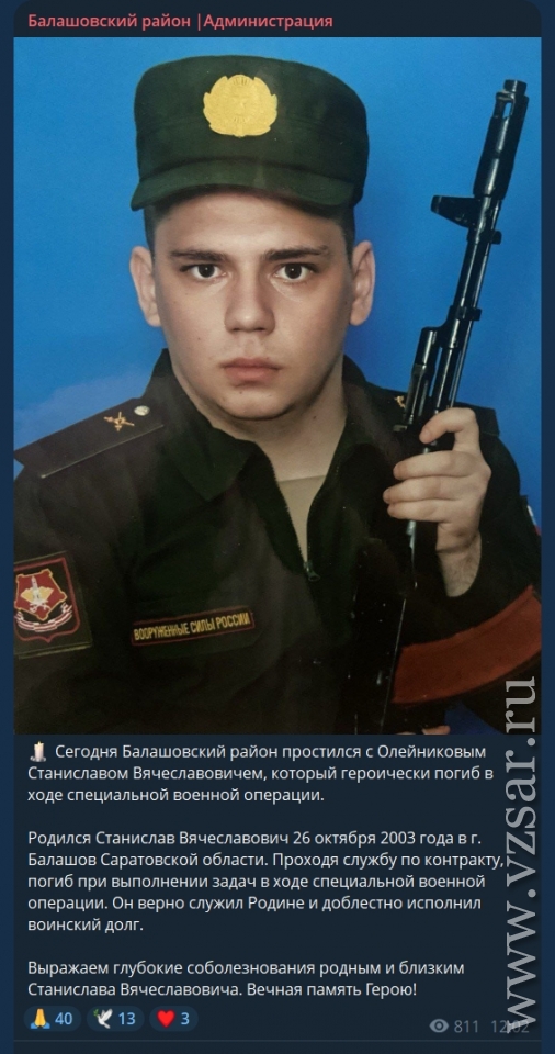 Администрация Балашовского района рассказала о прошедшем прощании с погибшим Станиславом Олейниковым.