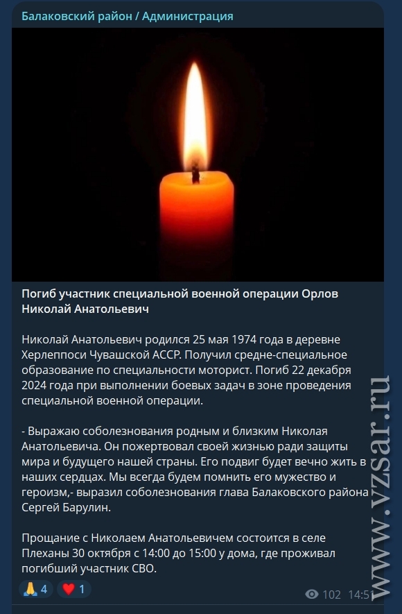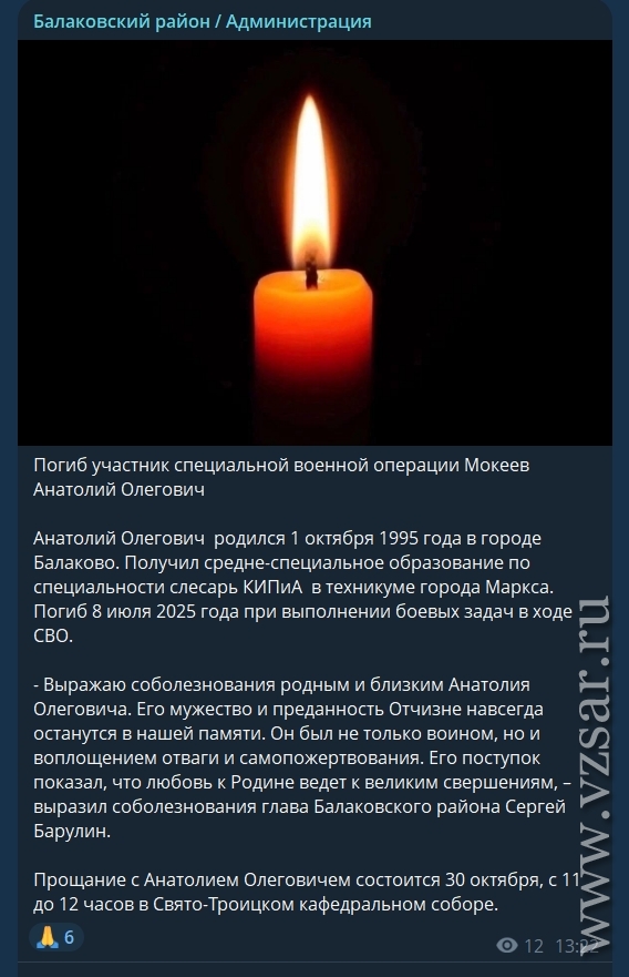 Администрация Балаковского района рассказала, что завтра в Балакове состоится прощание с погибшим Анатолием Макеевым, а в селе Плеханы простятся с погибшим Николаем Орловым.