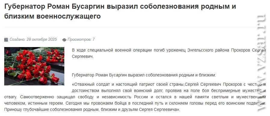 Администрация Энгельсского района без подробностей сообщила о гибели Сергея Прохорова.