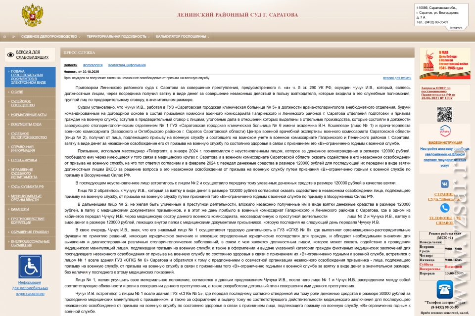 Установлено, что врач-отоларинголог Игорь Чучук, работая в ГУЗ "Саратовская городская клиническая больница № 5", был командирован на договорной основе в состав призывной комиссии военного комиссариата Гагаринского и Ленинского районов.