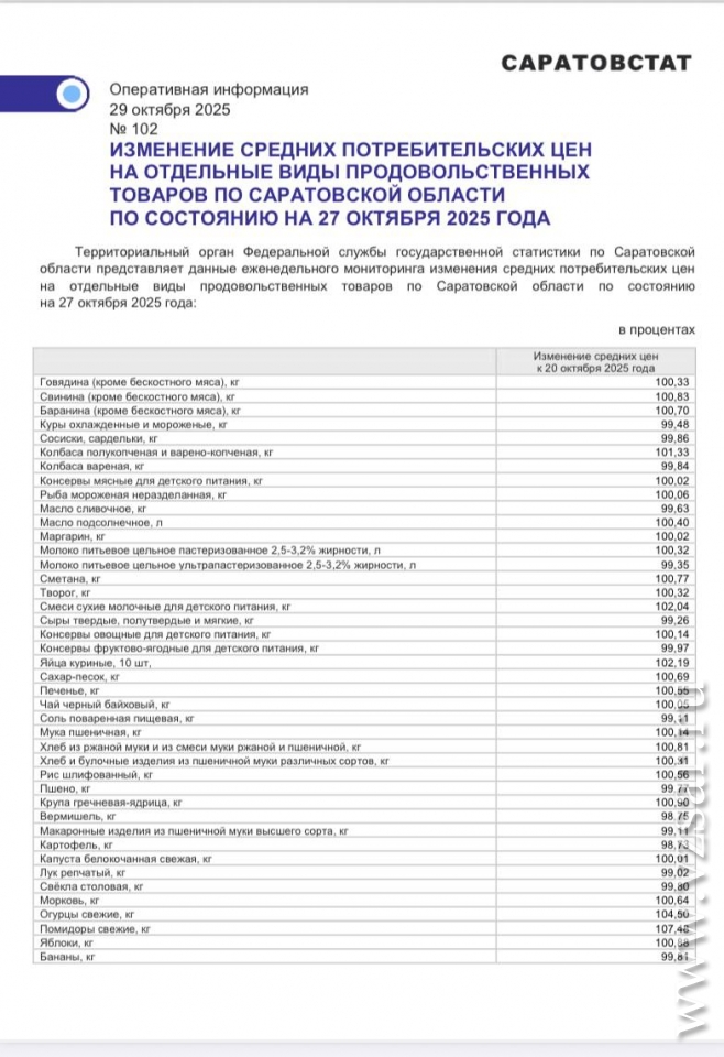 На 27 октября средняя цена сахара-песка в регионе составляла 66,54 руб./кг, муки – 50,79 руб./кг, десяток яиц – 79,41 руб., масла подсолнечного – 135,87 руб./л, масла сливочного – 1133,48 руб./кг, сметаны – 368,13 руб./кг, кур охлажденных и мороженых – 219,32 руб./кг, капусты – 28,85 руб./кг, свеклы – 33,27 руб./кг, лука – 36,84 руб./кг, картофеля – 35,29 руб./кг, макарон – 84,61 руб./кг, огурцов – 132,02 руб./кг, помидоров – 158,15 руб./кг, бананов – 149,5 руб./кг.