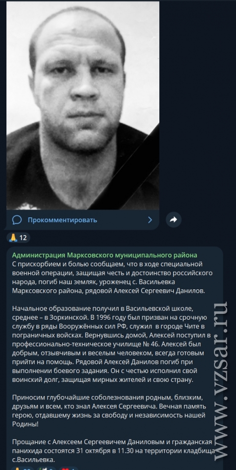 Администрация Марксовского района рассказала, что сегодня в селе Васильевка пройдет прощание с погибшим Алексеем Даниловым.