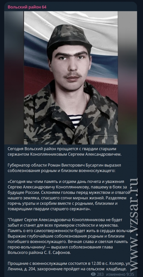 Администрация Вольского района рассказала, что сегодня в селе Колояр простились с погибшим старшим сержантом Сергеем Коноплянниковым.