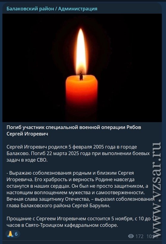 Администрация Балаковского района рассказала, что в среду, 5 ноября, пройдет прощание с погибшим Сергеем Рябовым.