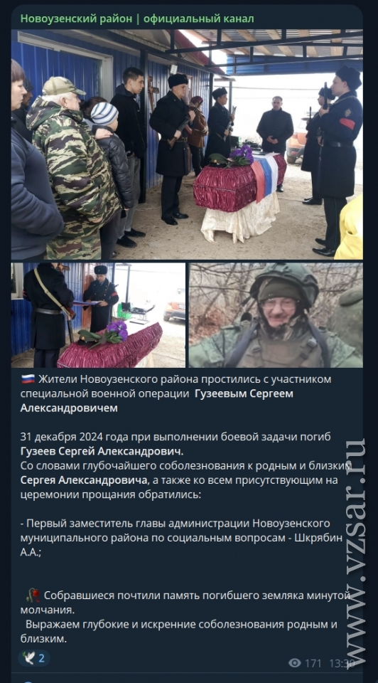 Также администрация Новоузенского района сообщила о прошедшем прощании с Сергеем Гузеевым, который погиб 31 декабря 2024 года при выполнении боевой задачи.