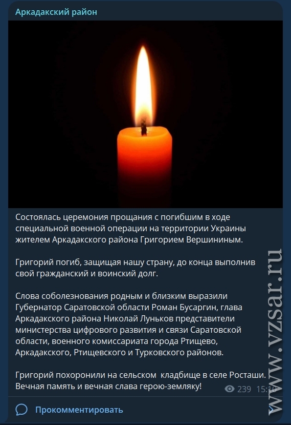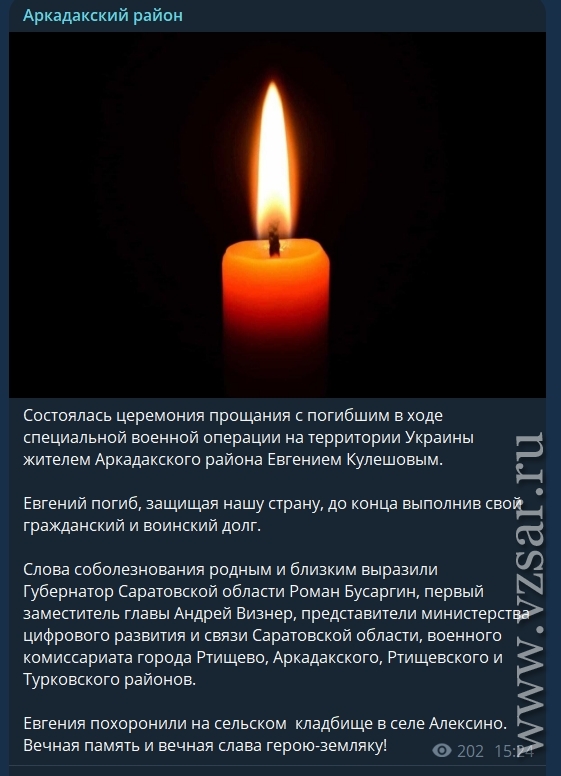 Администрация Аркадакского района рассказала, что сегодня в селе Алексино прошло прощание с погибшим Евгением Кулешовым, а в селе Росташи простились с погибшим Григорием Вершининым.