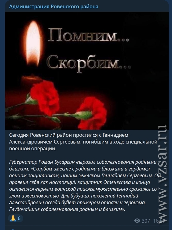 А администрация Ровенского района сообщила, что вчера прошло прощание с погибшим Геннадием Сергеевым.