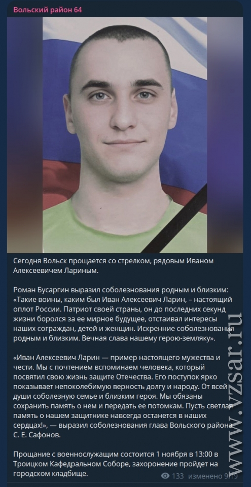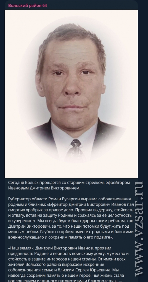 Администрация Вольского района рассказала, что сегодня пройдет прощание с погибшими ефрейтором Дмитрием Ивановым и рядовым Иваном Лариным.