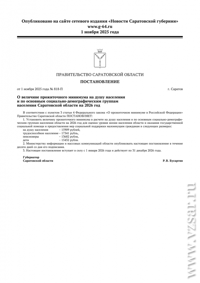 С 1 января 2026 года прожиточный минимум в Саратовской области в среднем на душу населения составит 15 909 рублей. Об этом сообщает региональное министерство труда и социальной защиты.