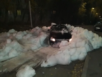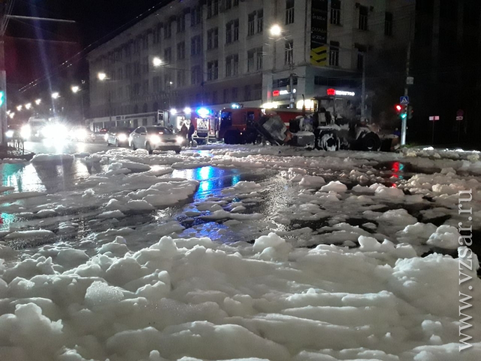 Трактор сгорел полностью. Весь перекресток у гостиницы "Олимпия" был залит пожарной пеной.