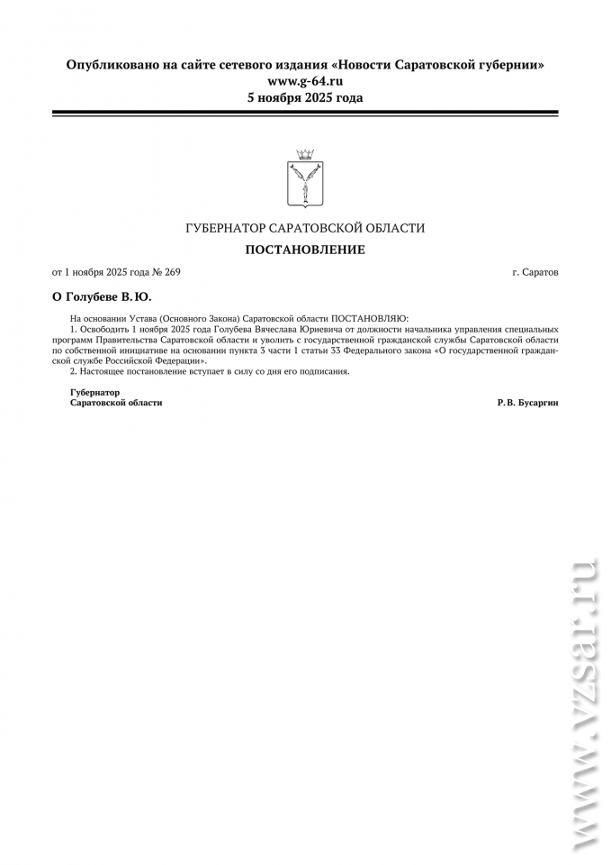 Начальник управления специальных программ правительства Саратовской области Вячеслав Голубев освобожден от должности. Соответствующее постановление подписал губернатор Роман Бусаргин.