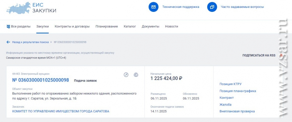 Второй аукцион как раз и касается работ по огораживанию здания. Подрядчику готовы заплатить 1 млн 225 тыс. 424 рубля из бюджета Саратова.