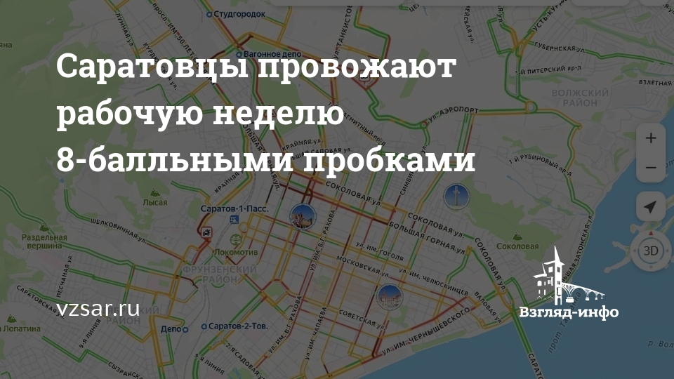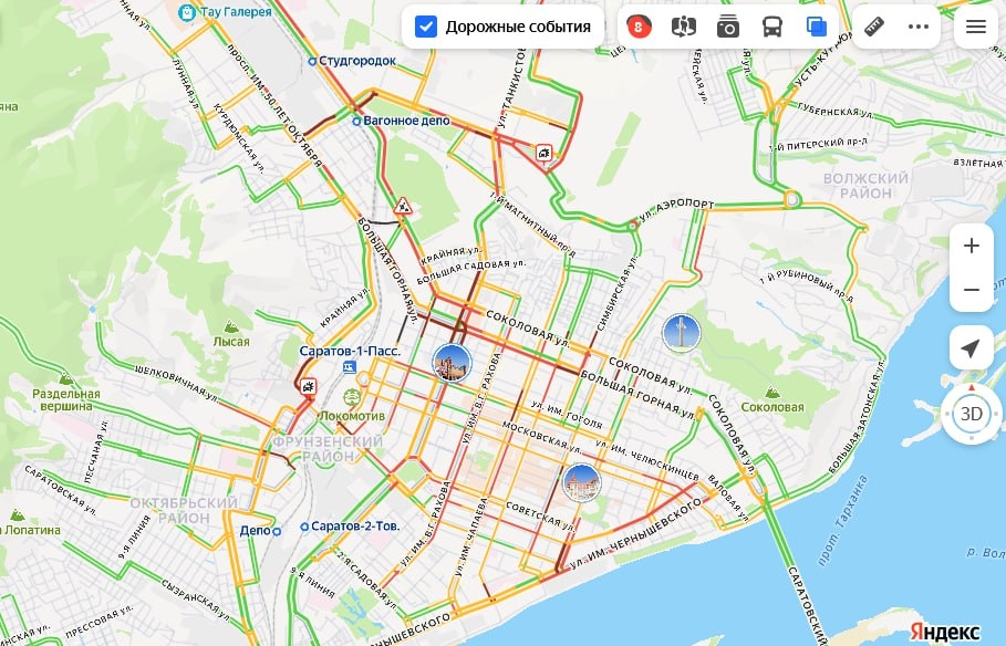Сегодня вечером в Саратове наблюдаются сильные пробки. Сервис "Яндекс. Карты" оценивают ситуацию на 8 из 10 баллов.