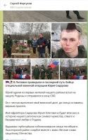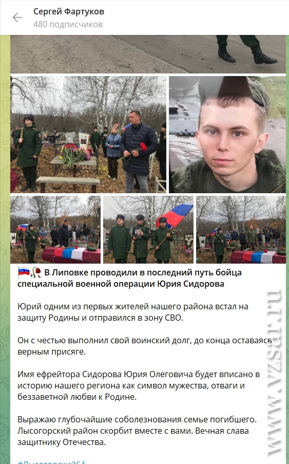 Глава Лысогорского района Сергей Фартуков уведомил земляков о гибели ефрейтора Юрия Сидорова.