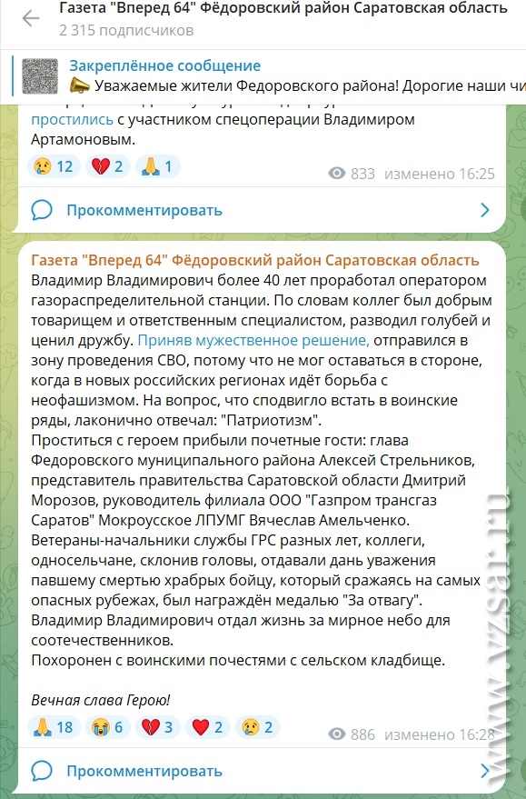 О гибели Владимира Артамонова сообщает газета Федоровского района "Вперед".
