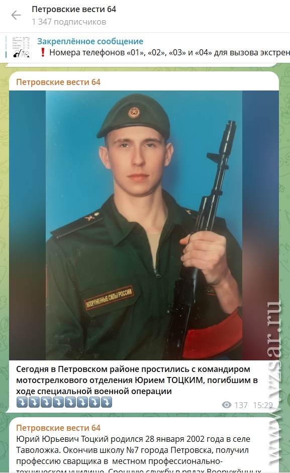 Газета "Петровские вести" рассказала о гибели младшего сержанта Юрия Тоцкого.