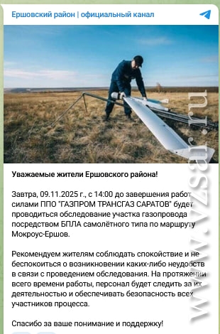 "С 14.00 до завершения работ силами ППО "Газпром Трансгаз Саратов" будет проводиться обследование участка газопровода посредством БПЛА самолетного типа по маршруту Мокроус – Ершов.