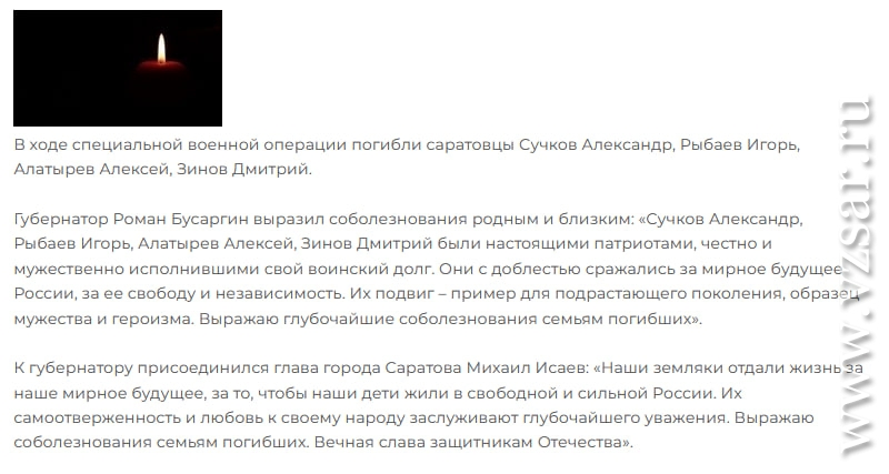 Администрация Саратова традиционно коротко рассказала о гибели Александра Сучкова, Игоря Рыбаева, Алексея Алатырева и Дмитрия Зинова.