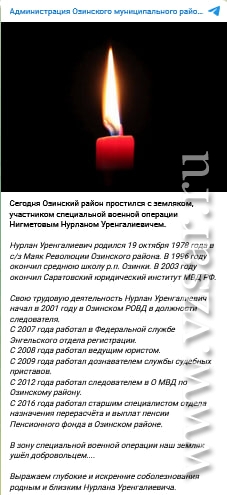 Администрация Озинского района сообщила о гибели Нурлана Нигметова.