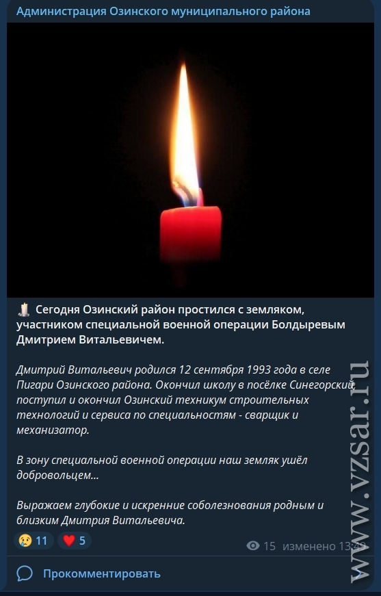 Администрация Озинского района рассказала о прошедшем сегодня прощании с погибшим Дмитрием Болдыревым.