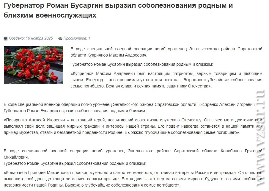 Администрация Энгельсского района без подробностей сообщила о гибели Максима Куприянова, Алексея Писаренко и Григория Колабанова.