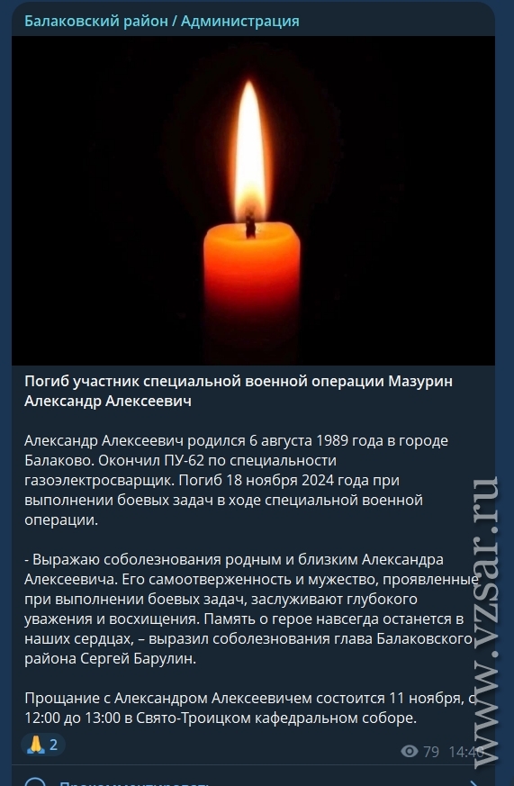 Также администрация Балаковского района рассказала, что завтра состоится прощание с погибшим Александром Мазуриным.