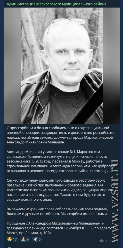 Администрация Марксовского района сообщает, что в среду, 12 ноября, пройдет прощание с погибшим Александром Милешиным.