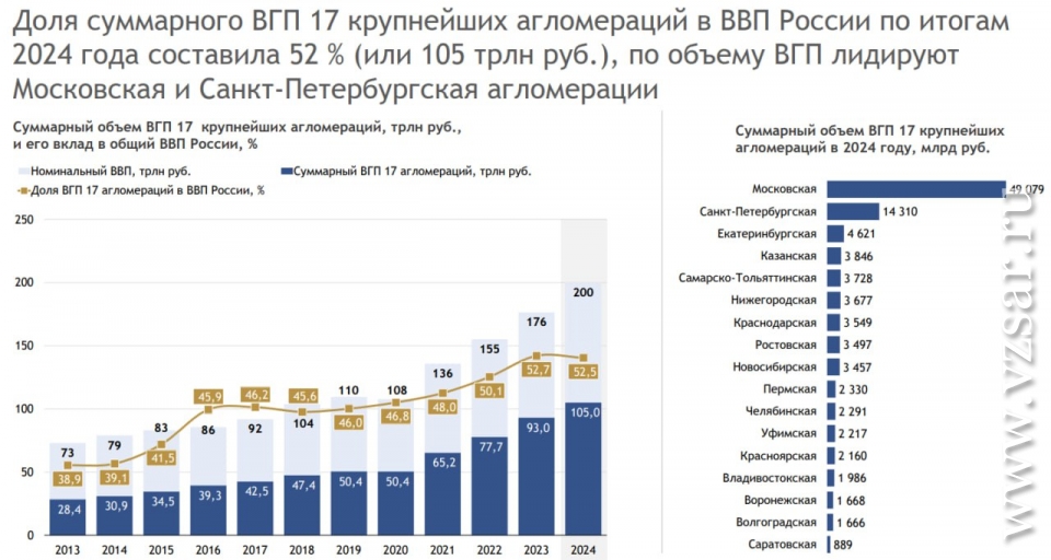 Суммарный объем ВГП Саратовской агломерации в прошлом году составил 889 млрд рублей (вклад – 0,4% от общего объема ВВП России). Это самый низкий показатель среди 17 крупнейших агломераций страны. За 11 лет (с 2013 по 2024 годы) вклад Саратовской агломерации в ВВП России также оказался самым низким из представленных – 2,2%, говорится в исследовании.