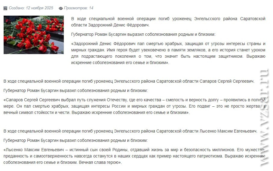 Администрация Энгельсского района без подробностей сообщила о гибели Дениса Задорожного, Сергея Сапарова и Максима Лысенко.