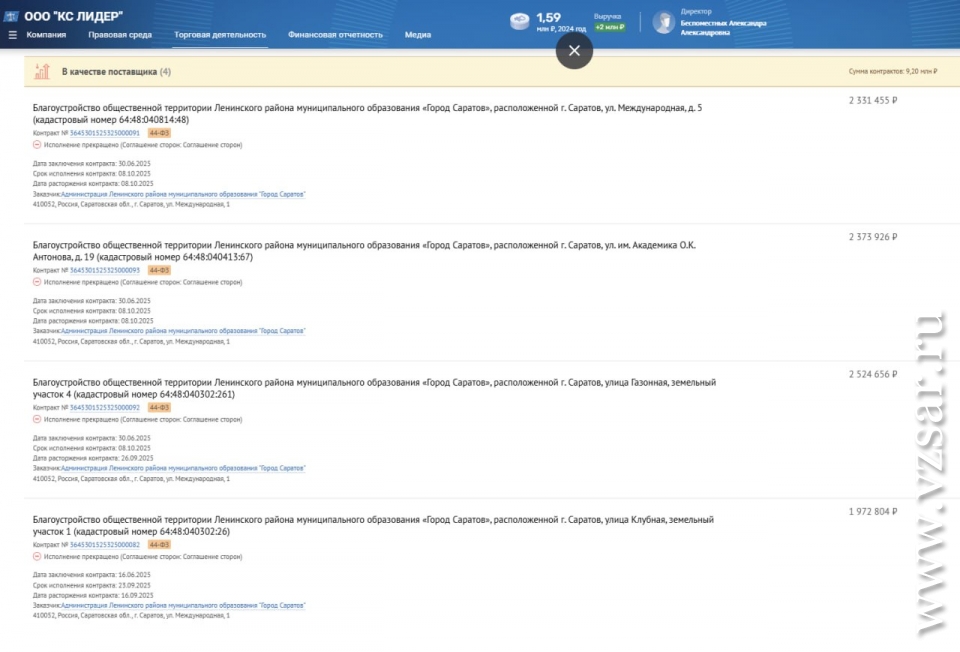 Уже в июне организация заключила с администрацией Ленинского района сразу четыре контракта на благоустройство общественных территорий на общую сумму 9,2 млн рублей (см. фото; источник - база данных Seldon.Basis).
