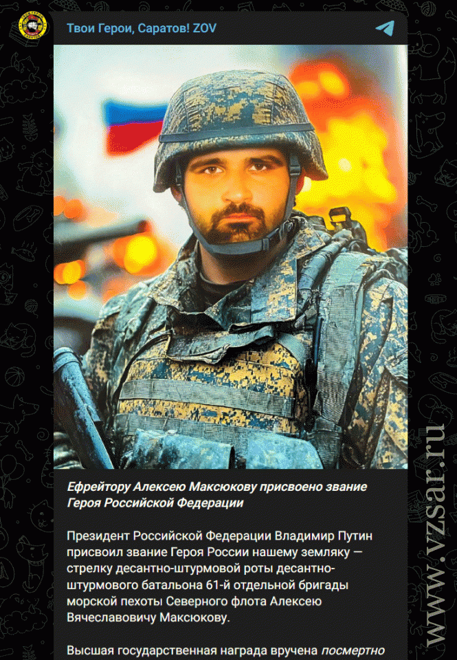 Погибшему в ходе специальной военной операции жителю Саратовской области ефрейтору Алексею Максюкову присвоено звание Героя Российской Федерации (посмертно). Об этом сообщает тг-канал "Твои герои, Саратов!", созданный депутатом Саратовской облдумы, Героем России Александром Янкловичем.