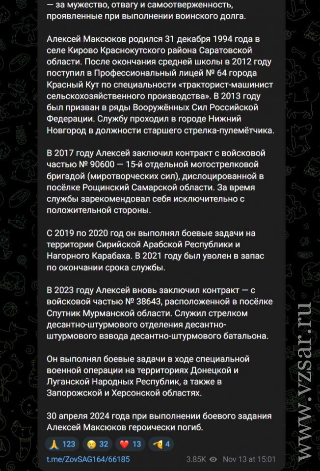 30 апреля 2024 года при выполнении боевого задания Алексей Максюков героически погиб.