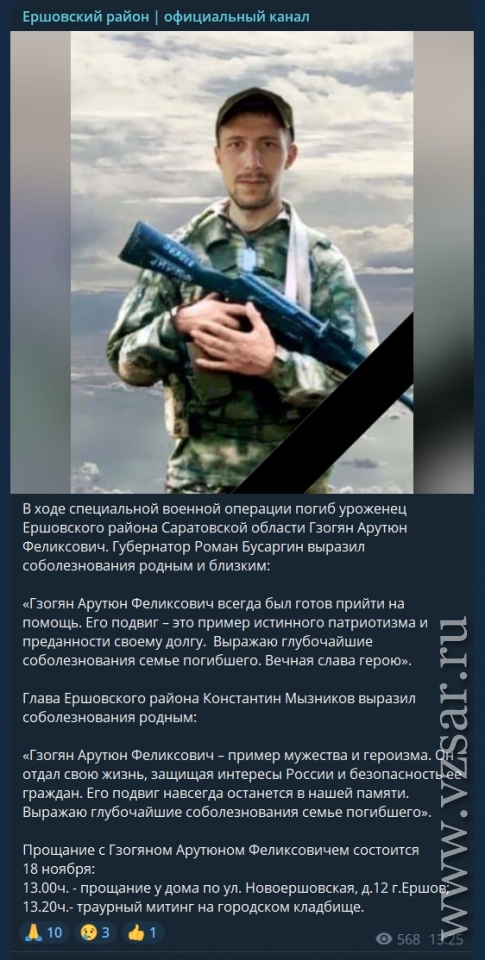 Также администрация Ершовского района сообщает, что завтра состоится прощание с погибшим Арутюном Гзогяном.