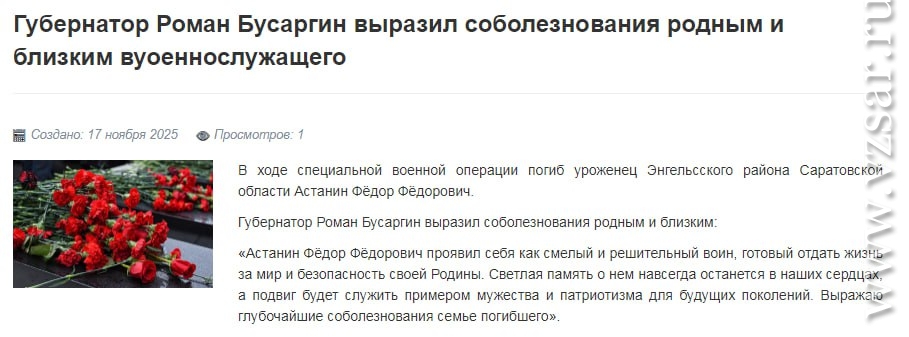 Администрация Энгельсского района без подробностей сообщила о гибели Федора Астанина.