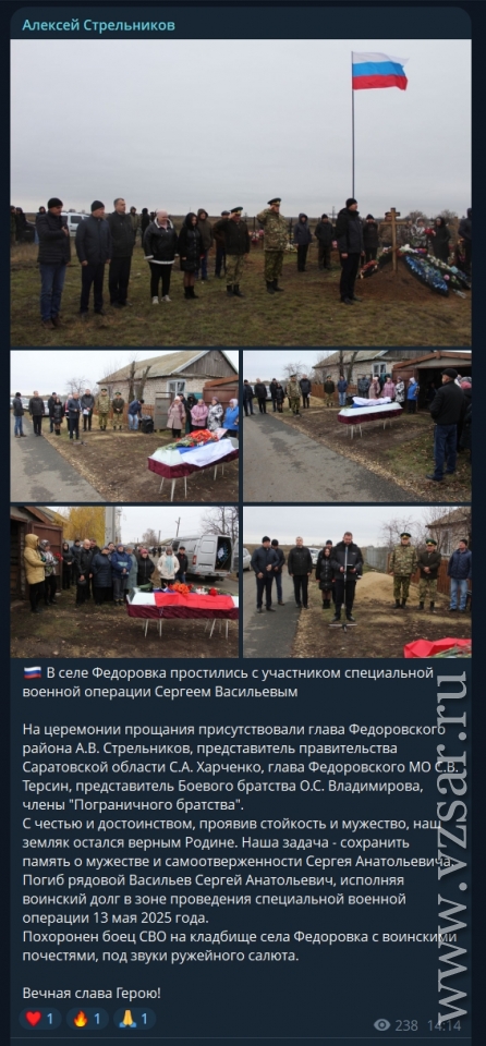 Глава Федоровского района Алексей Стрельников рассказал о прошедшем в селе Федоровка прощании с погибшим 13 мая Сергеем Васильевым.