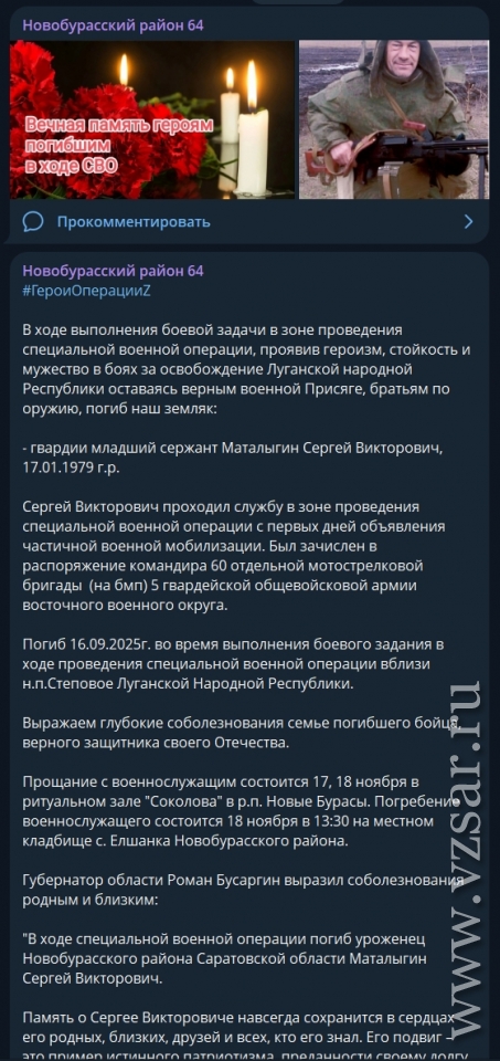 Администрация Новобурасского района рассказала, что завтра в селе Елшанка простятся с погибшим младшим сержантом Сергеем Маталыгиным.