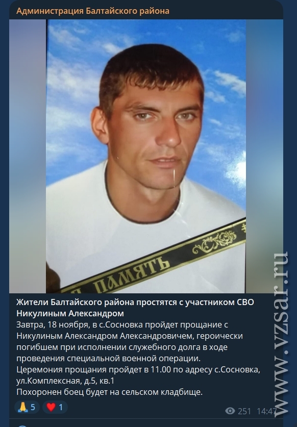 Администрация Балтайского района сообщает, что завтра в селе Сосновка пройдет прощание с погибшим Александром Никулиным.